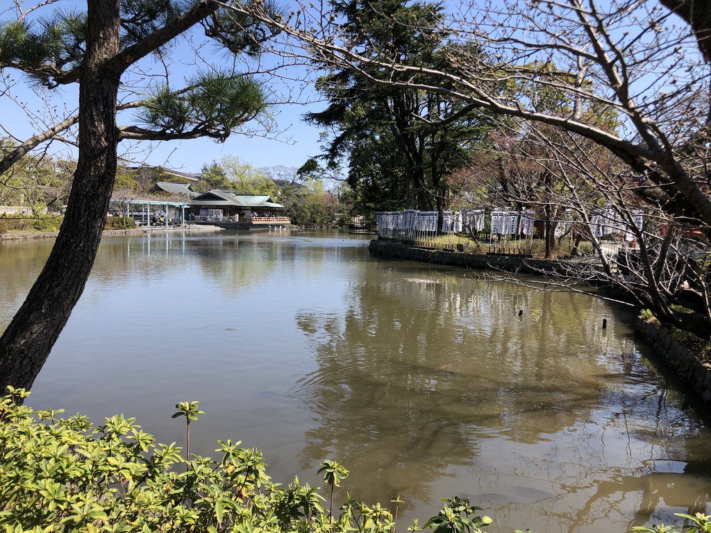 I visited several smaller shrines and temples along a side street until I made my way to a massive park which housed the Tsurugaoka Hachimangu Shrine along with several other tourist attractions. I had bypassed the large raised walkway that leads to the entrance (worth checking out if you visit). The pathway is known as the Dankazura and is raised so that nobles and samurai could easily walk to the park while avoiding the often flooded streets on either side. I made my way inside wide-eyed and ready to checkout some breathtaking sights. I was in awe of the beauty and size of the park itself. The main walkway is lined with smaller vendors selling different traditional snacks and desserts. As I crossed the two arched bridges into the park I noticed smaller ponds located on my right and my left. The pond on the right even had a little walkway onto a small island that housed what looked to be another smaller shrine.